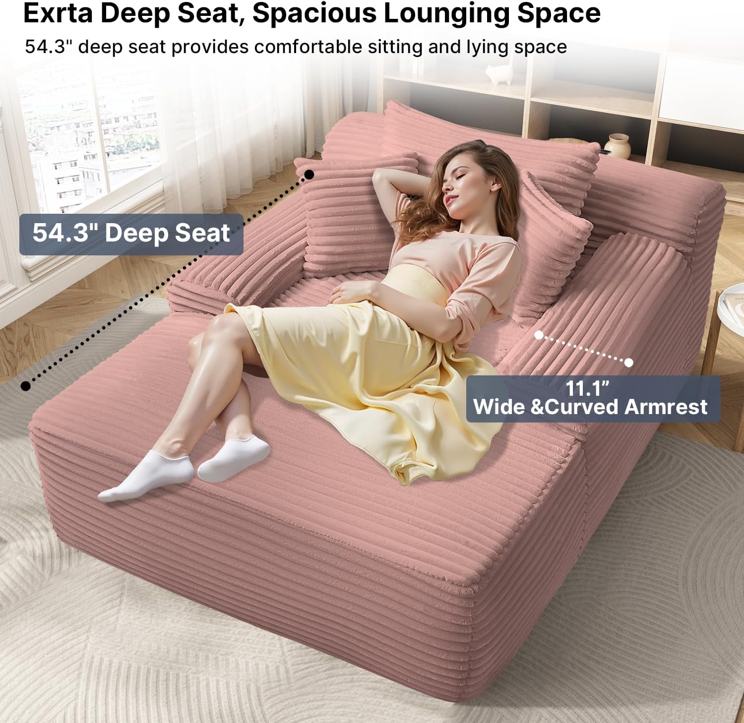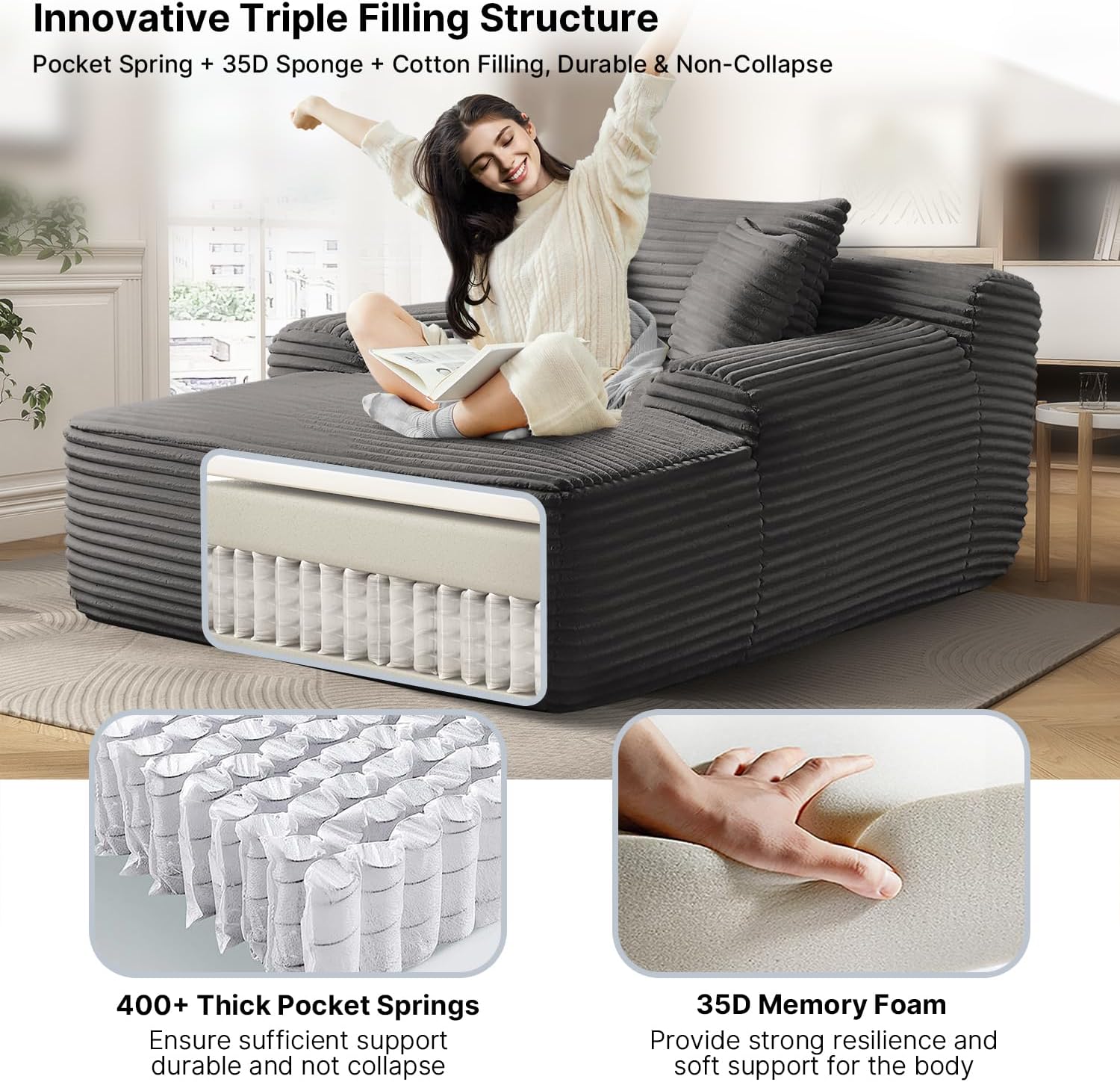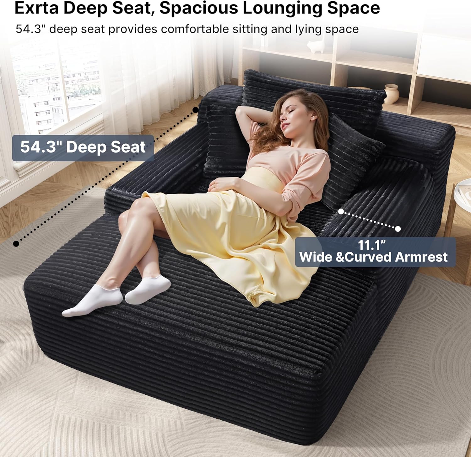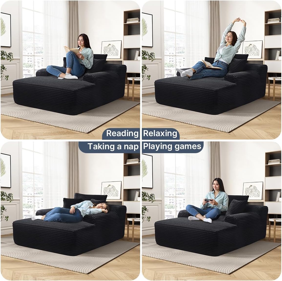 - 【Plush Corduroy Fabric】Oversized chaise lounge features skin-friendly, breathable corduroy fabric, offering a beautiful sheen along with an exceptional tactile experience, providing a more comfortable sitting and reclining experience.