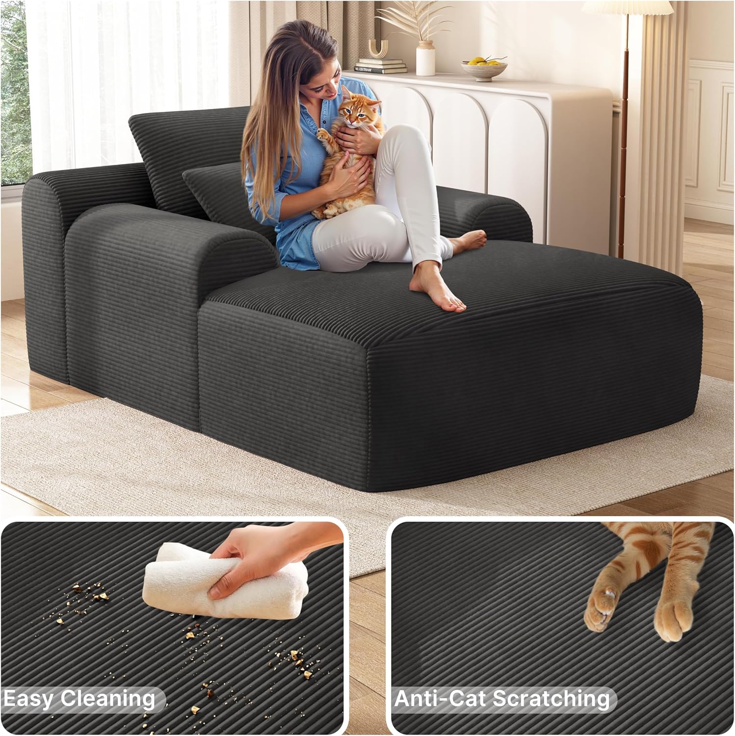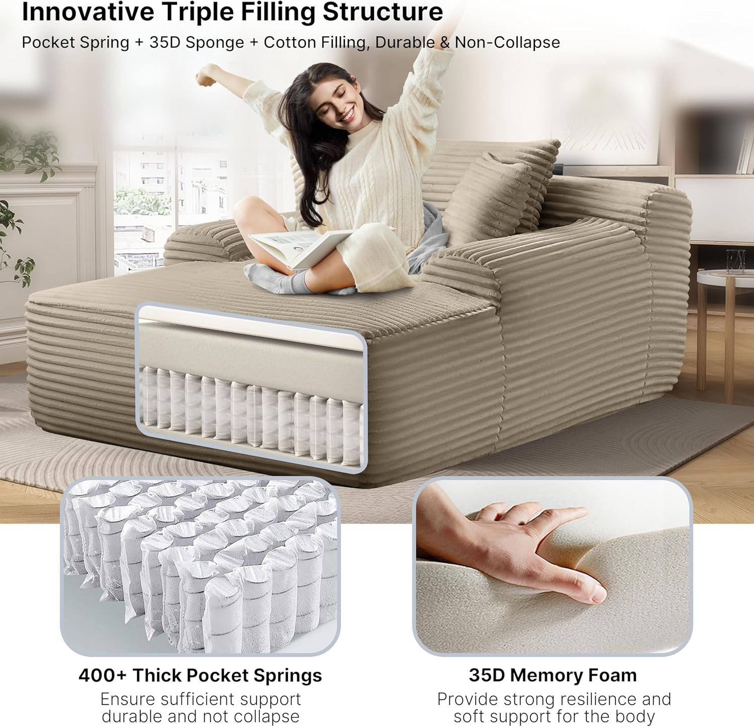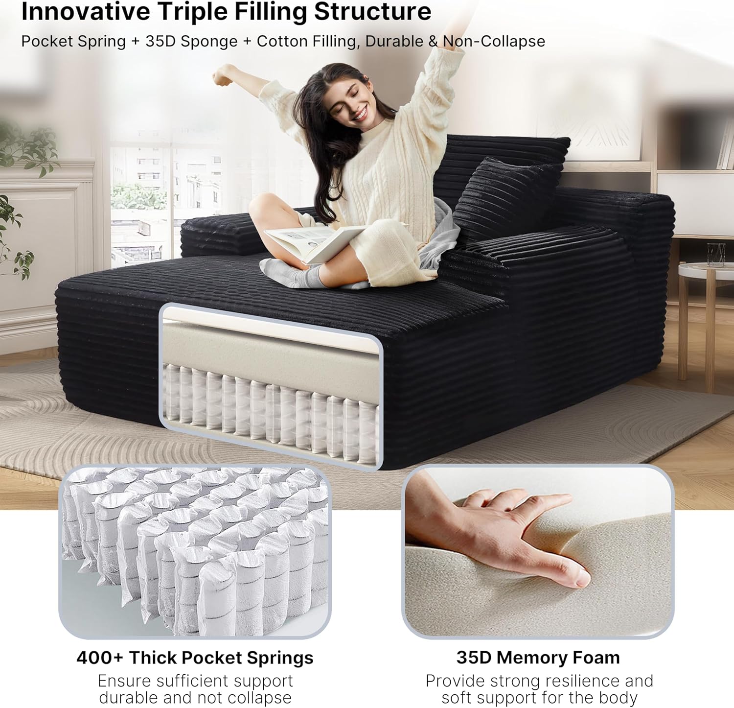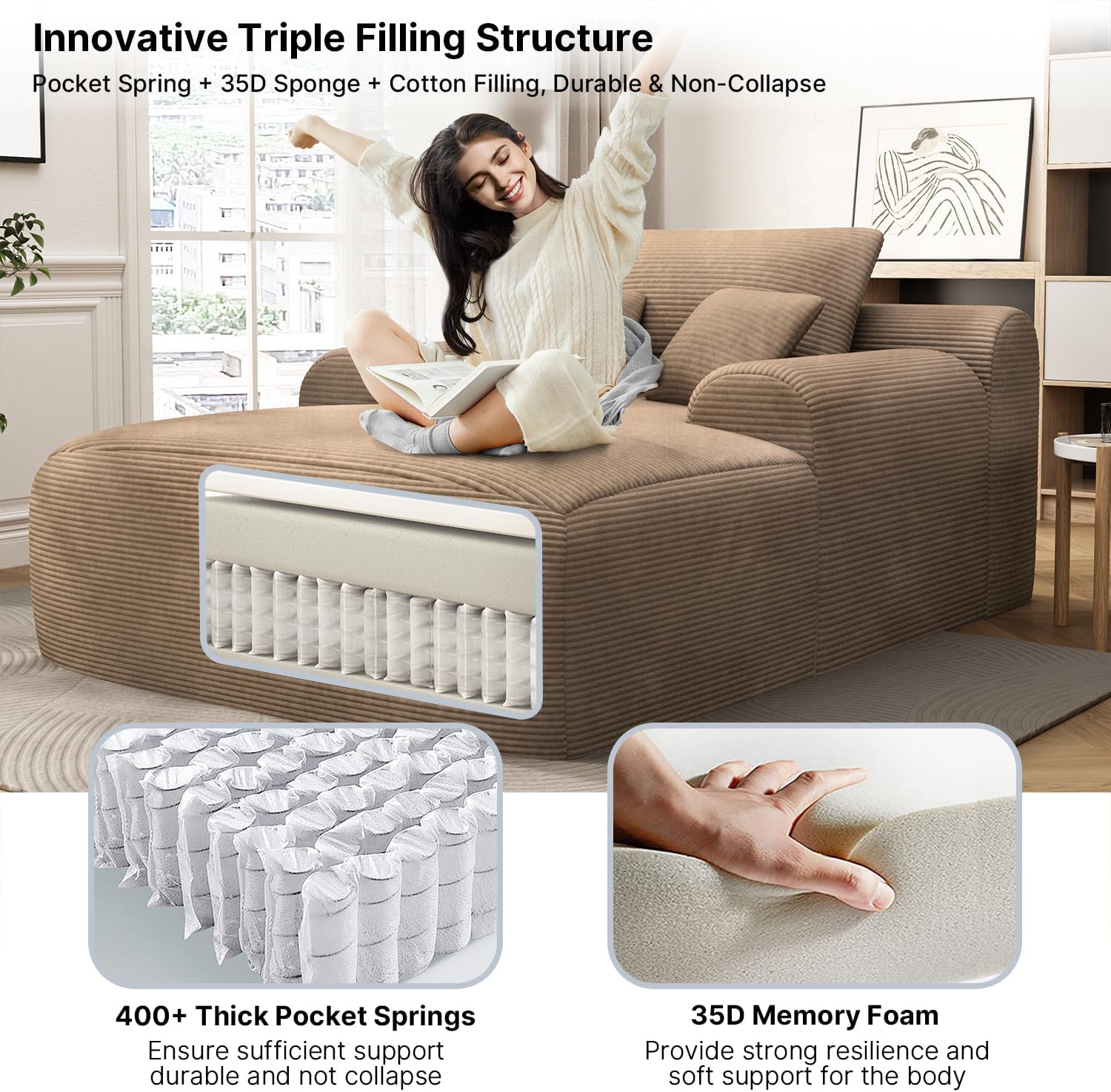 - 【Plush Corduroy Fabric】Oversized chaise lounge features skin-friendly, breathable corduroy fabric, offering a beautiful sheen along with an exceptional tactile experience, providing a more comfortable sitting and reclining experience.
