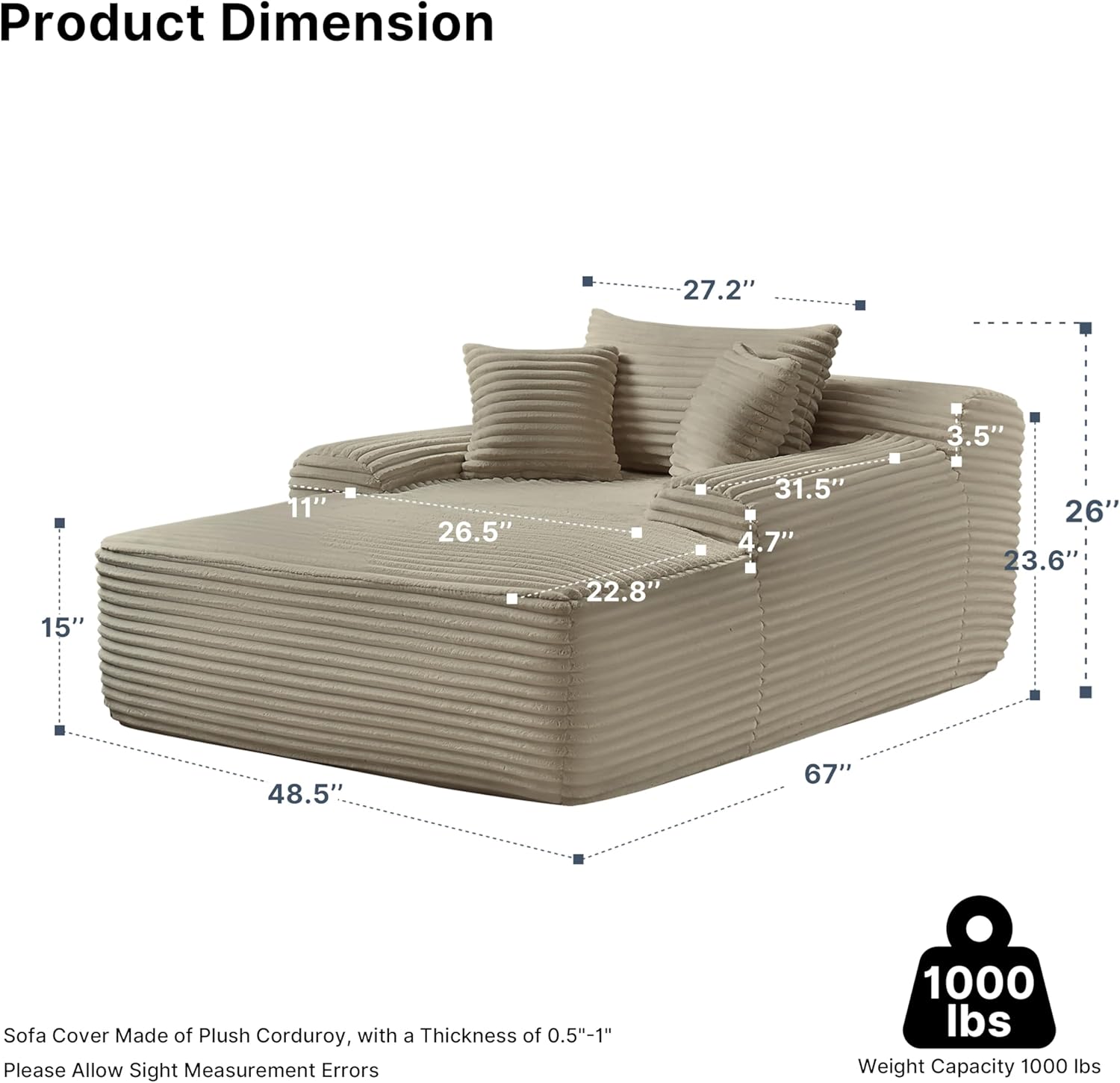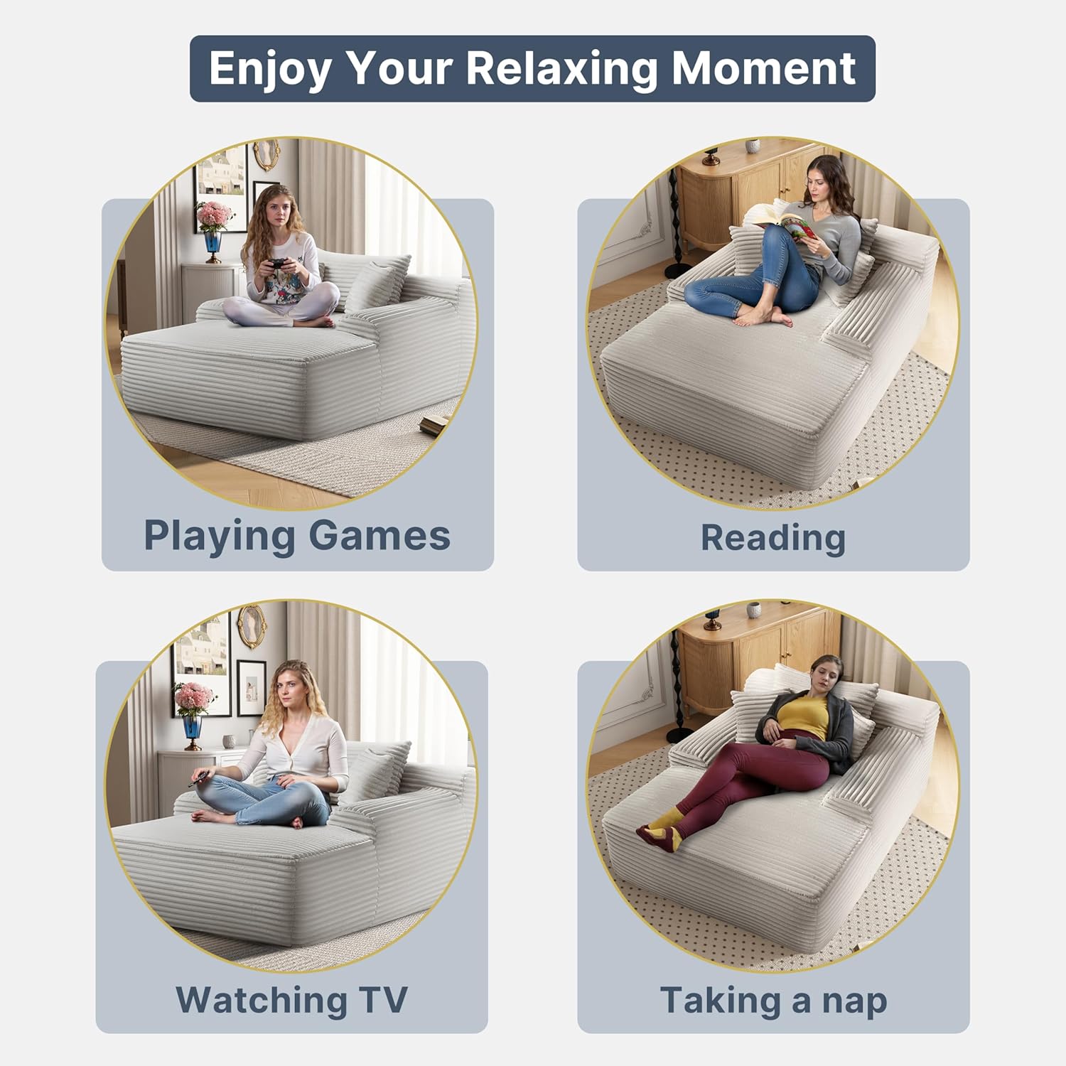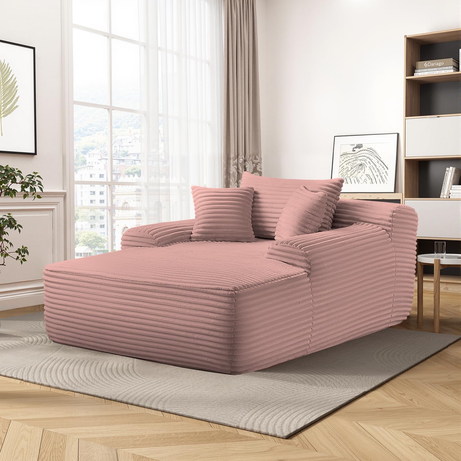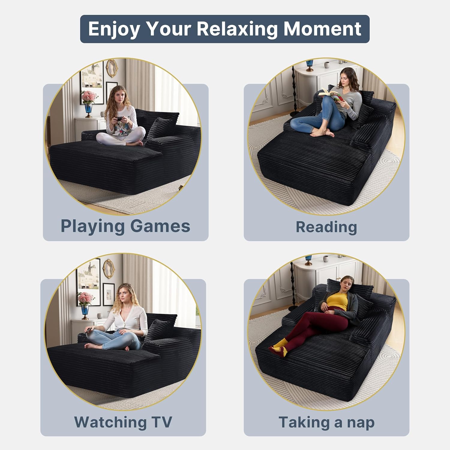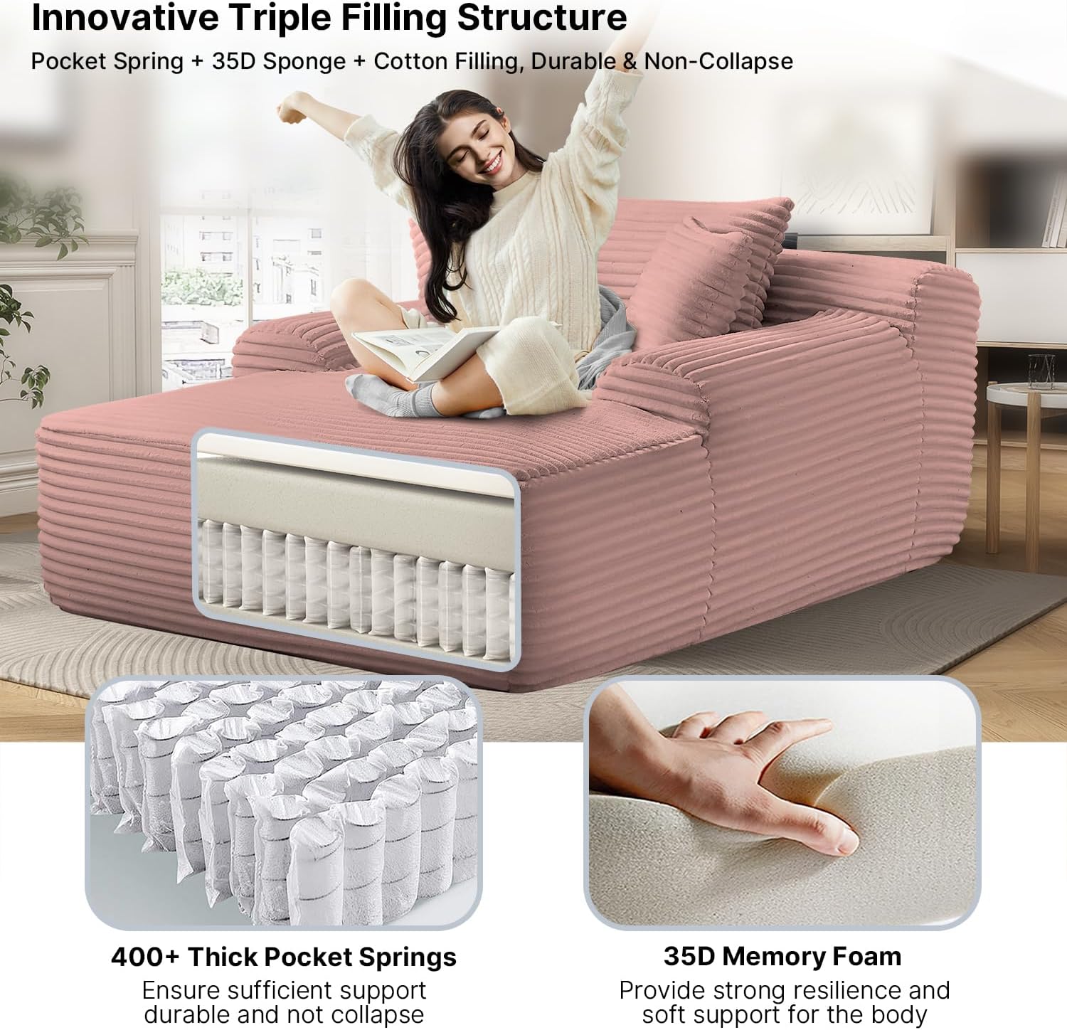 - 【Plush Corduroy Fabric】Oversized chaise lounge features skin-friendly, breathable corduroy fabric, offering a beautiful sheen along with an exceptional tactile experience, providing a more comfortable sitting and reclining experience.