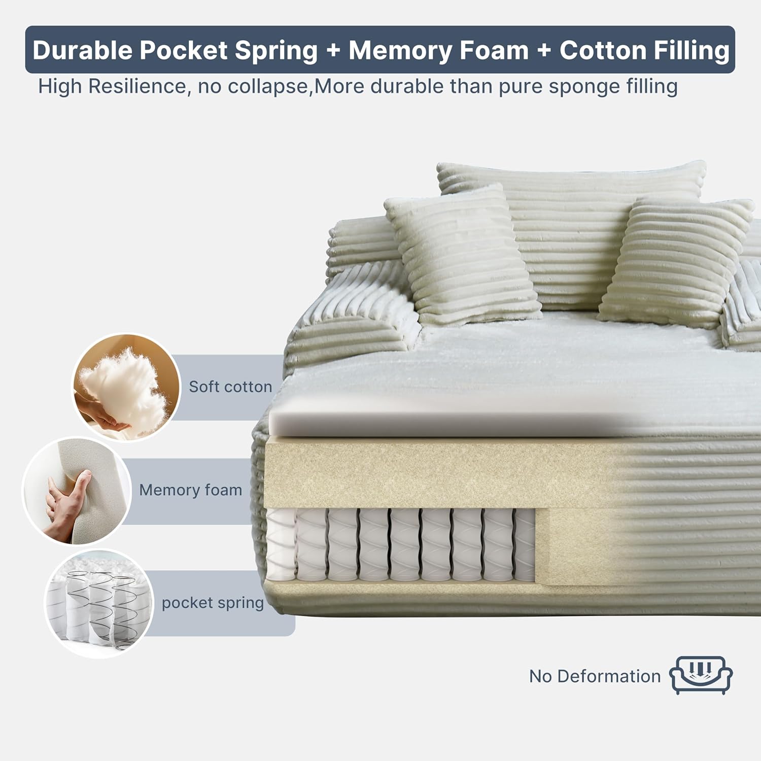 - 【Durable & Sturdy】The sleeper sofa bed features a pocket spring system paired with high-density memory foam construction, ensuring complete shape recovery after compression and transportation. .Rigorously tested for durability, this corduroy cloud couch will not collapse or deform even with prolonged jumping by children.