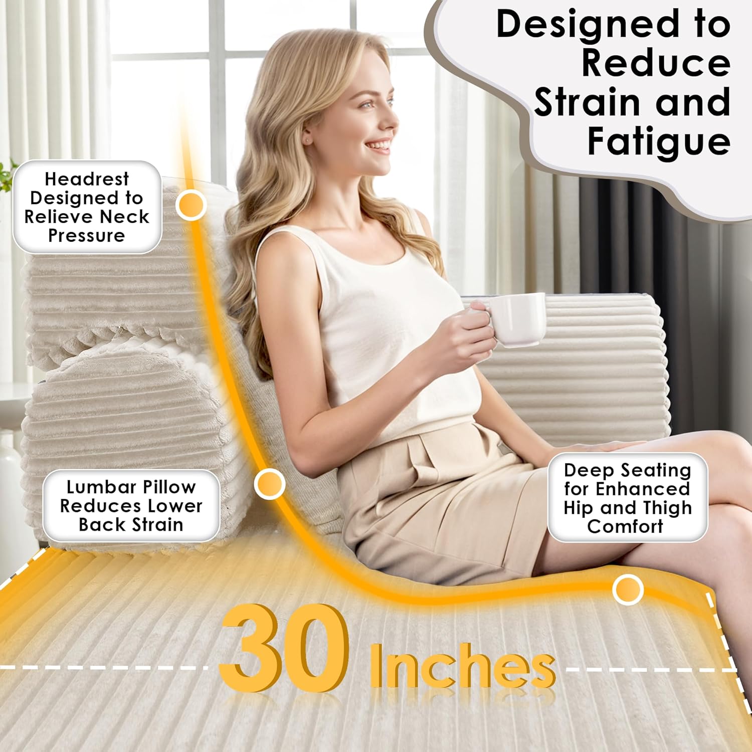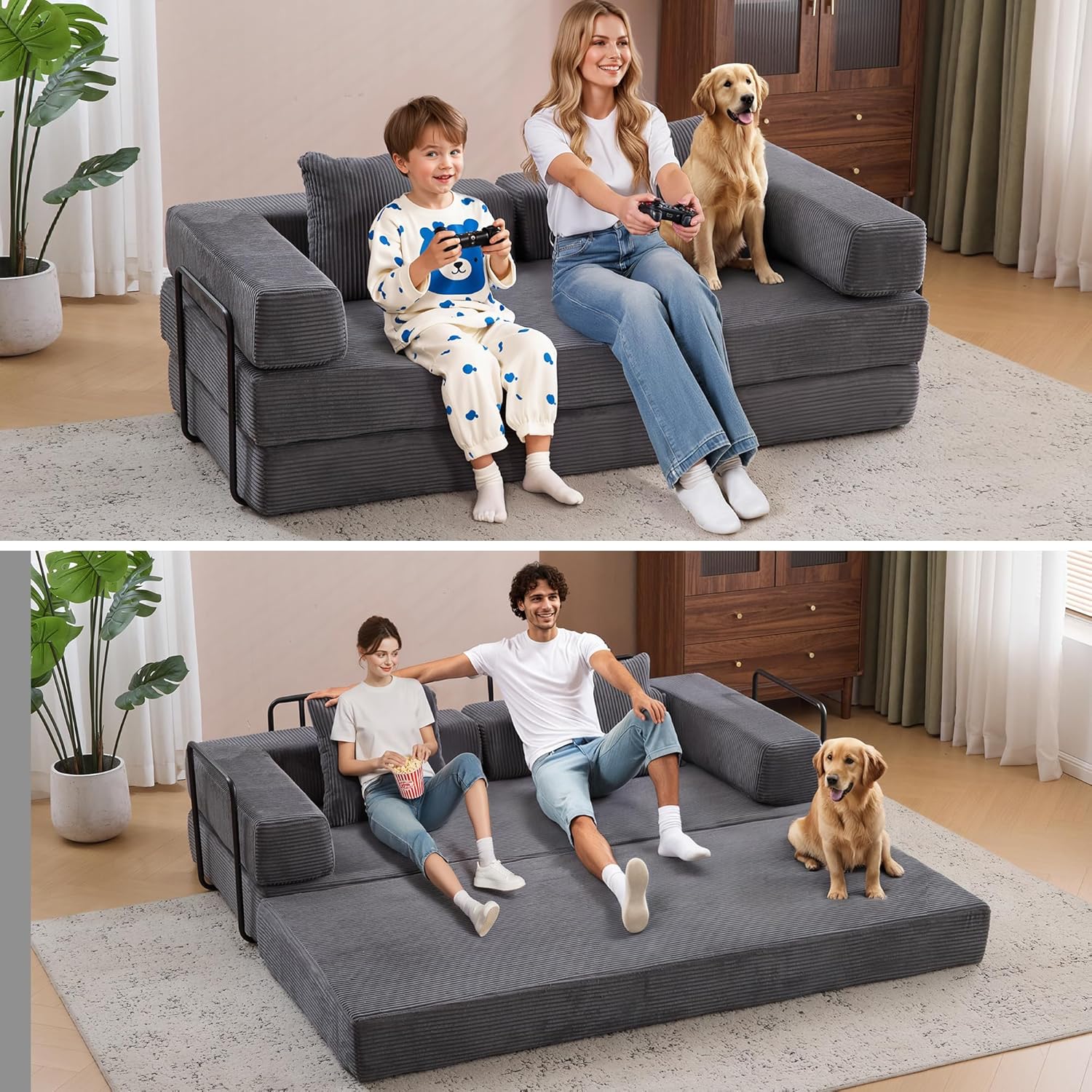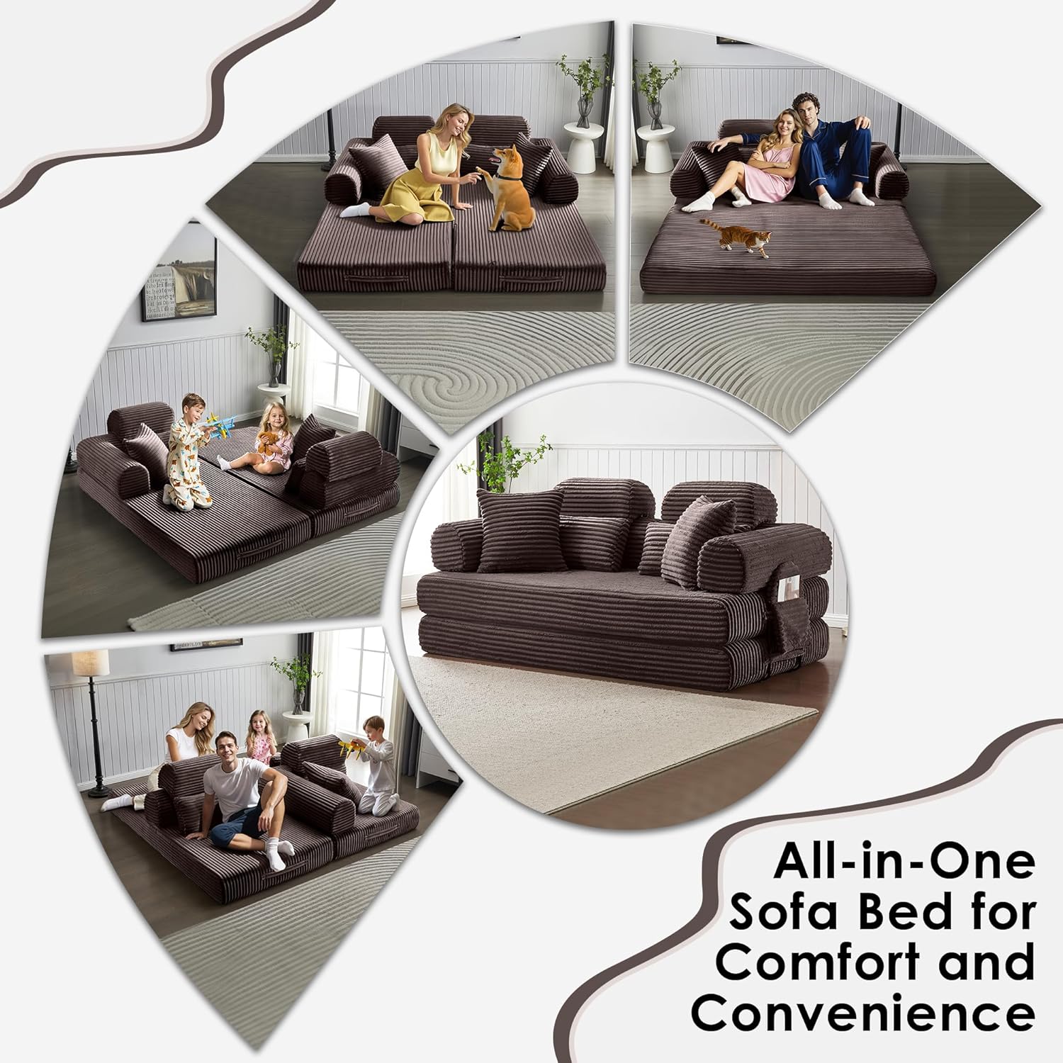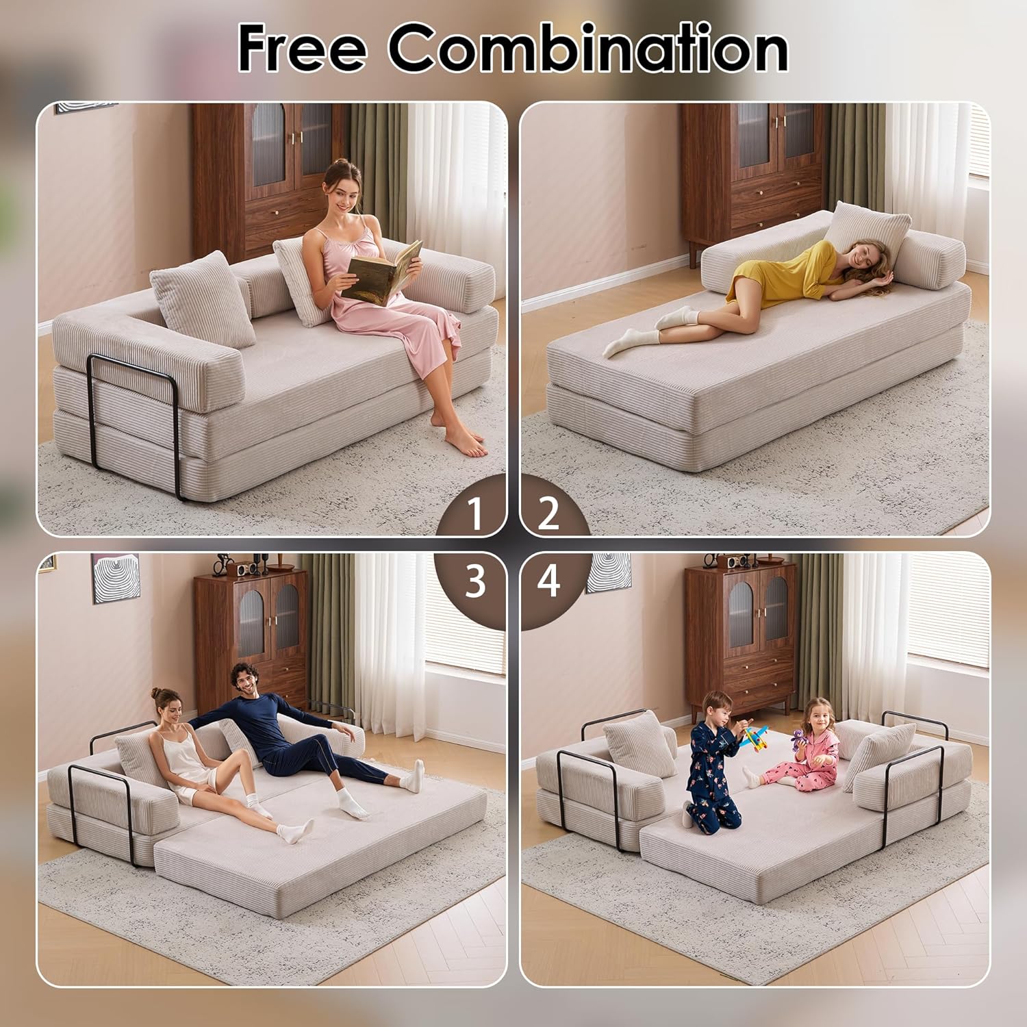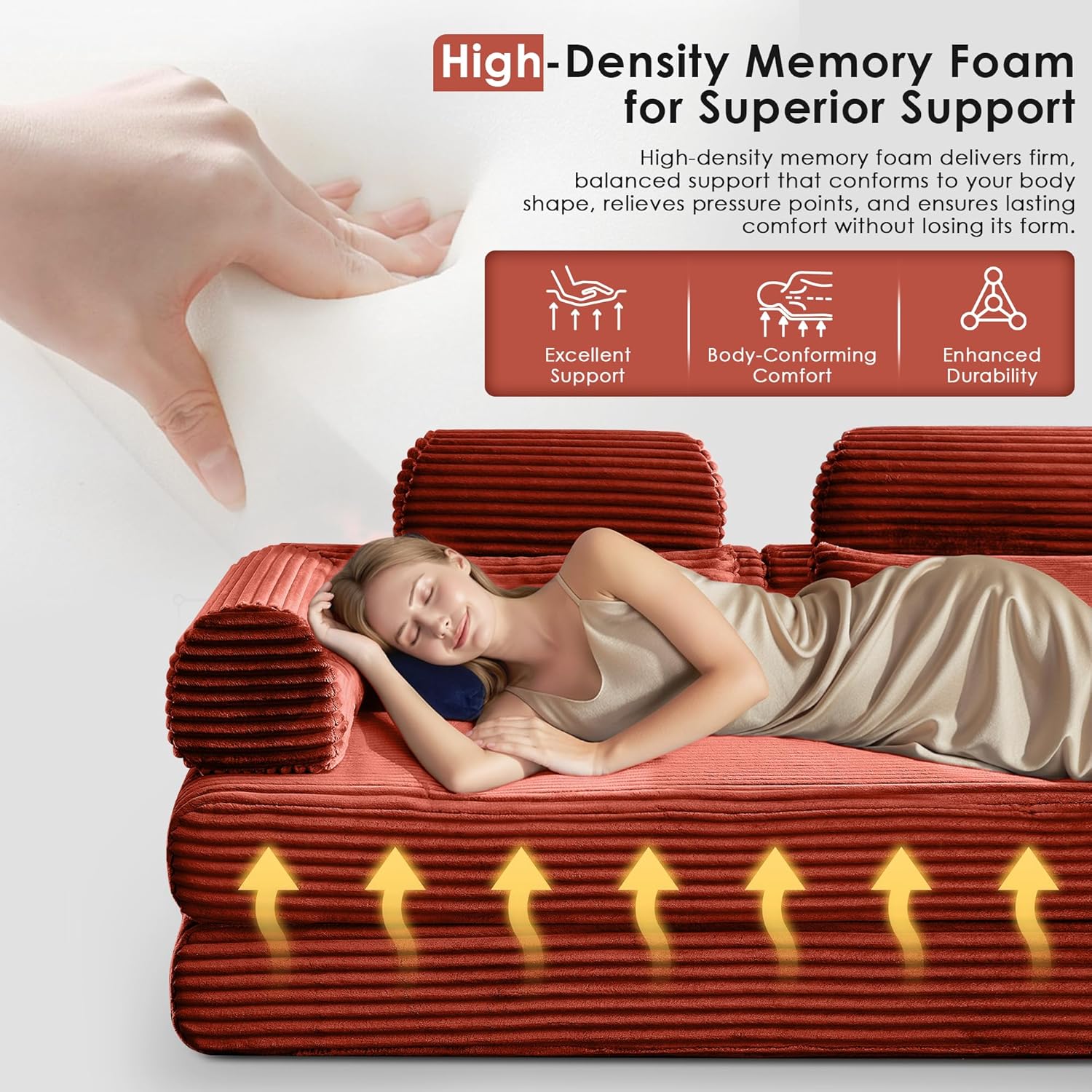 - 𝑷𝒓𝒆𝒎𝒊𝒖𝒎 𝑪𝒐𝒎𝒇𝒐𝒓𝒕 & 𝑬𝒓𝒈𝒐𝒏𝒐𝒎𝒊𝒄 𝑼𝒑𝒈𝒓𝒂𝒅𝒆 - Now enhanced with a newly added headrest and lumbar pillow, this upgraded folding sofa bed offers even greater ergonomic support and comfort. Wrapped in soft, breathable corduroy fabric, it’s designed for truly relaxing moments. High-density memory foam cushions provide pressure-relieving support, while the new head and waist pillows contour to your body, offering optimal alignment and comfort whether you're lounging, reading, or simply unwinding.