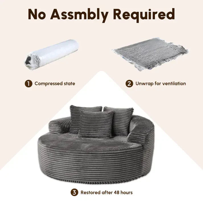Ovios 59" W Oversized Round Chaise LoungeDiscover the ultimate relaxation experience with the Ovios 59" W Oversized Round Chaise Lounge. This stylish and comfortable sofa is designed to provide ultimate comfort and relaxation.Key Features:·Oversized Round Design: Offers a modern and contemporary look, perfect for modern living spaces.·Chaise Lounge: Provides additional seating and relaxation, ideal for lounging or watching TV.·Fluffy Lazy Bean Bag: Offers a cozy and inviting feel, perfect for lounging or relaxing.·3 Pillows for Free: Enjoy the added comfort and relaxation of extra pillows without any additional cost.·Chenille Upholstered: Adds a touch of elegance and warmth to the sofa.·Barrel Sleeper Bed: Offers additional comfort and support, making it a great choice for extended relaxation.·Modern Deep Seat Cloud Couch: Designed for a contemporary and stylish look, perfect for modern living rooms. Elevate your living space with the Ovios 59" W Oversized Round Chaise Lounge, where comfort meets style.Ovios 59" W Oversized Round Sofa Bed - Fluffy Lazy Bean BagDiscover the ultimate relaxation solution with the Ovios 59" W Oversized Round Sofa Bed - Fluffy Lazy Bean Bag. This modern deep seat couch is designed for comfort and style, making it an ideal choice for your living space. Key Features:·Dimensions: 59 inches in width, providing ample seating for everyone.·Material: Made from plush corduroy fabric, offering a soft and cozy feel.·Design: Oversized round design for a modern and stylish look.·Seating: Features a fluffy lazy bean bag for added comfort and a cozy feel.·Functionality: 3 pillows included for added comfort and support. No assembly required, making it easy to set up and use right away. Benefits:·Comfort: The plush corduroy fabric ensures a soft and cozy seating experience.·Convenience: The 3 pillows provide additional comfort and support.·Ease of Use: No assembly required, allowing for quick setup and use.Enhance your living space with the Ovios 59" W Oversized Round Sofa Bed - Fluffy Lazy Bean Bag, combining comfort, style, and ease of use.